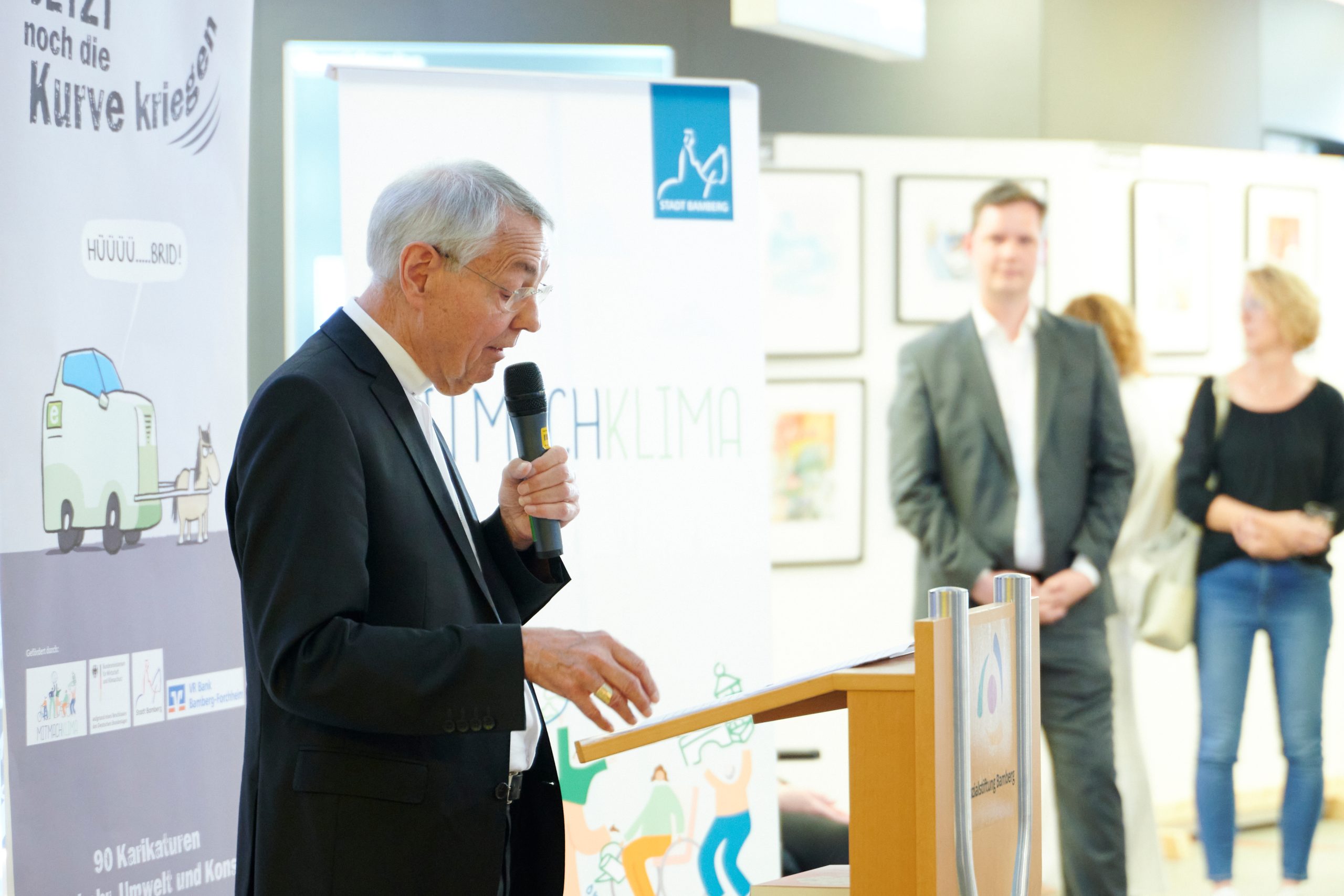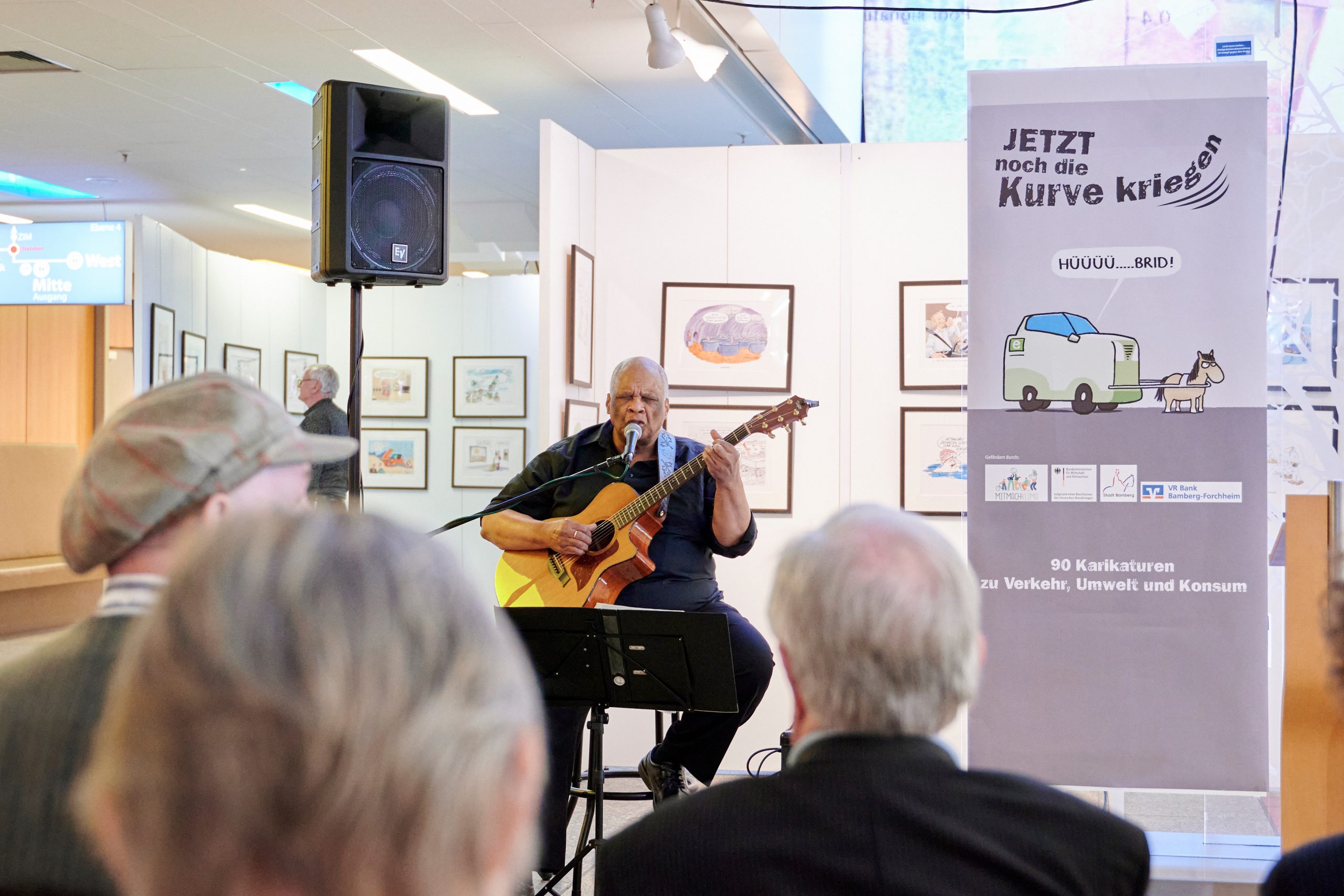 Als dritter Redner erläuterte Erzbischof em. Dr. Ludwig Schick, wie das Erzbistum ihren Weg zur Karikaturen gefunden hat. Für eine entspannte Atmosphäre sorgte die musikalische Untermalung durch Toni Bulluck, der mit Blues- und Jazzklängen das Event bereicherte. Den Abschluss bildete der Poetry-Slam von Maron Fuchs, die in ihrem Auftritt sowohl die Bequemlichkeit der Menschen thematisierte als auch eindringlich dazu aufrief, sich für den Schutz der Natur einzusetzen und jede Stimme zu erheben.