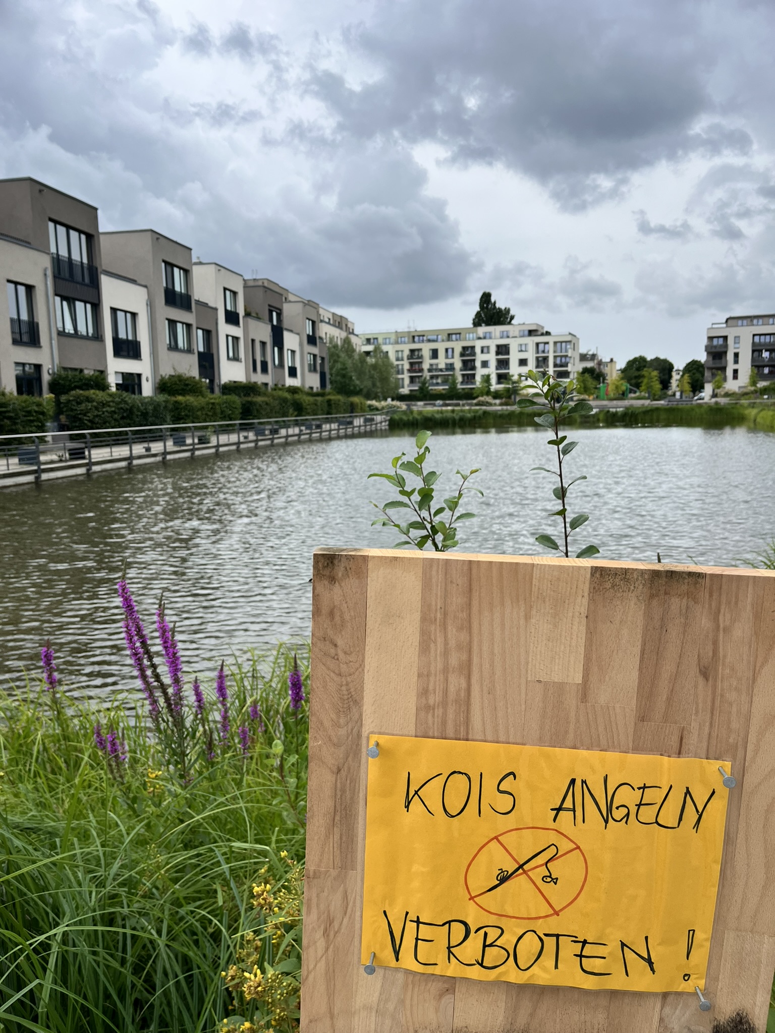 Besonders beeindruckend an diesem Projekt ist die nachhaltige Versorgung der Wohnungen über Nahwärme, die vielfältigen Begrünungen und die drei großen Niederschlagsbecken in der Mitte des Quartiers. Diese Becken sammeln den Niederschlag der umliegenden Wohnhäuser auf einer Wasserfläche von 6.000 Quadratmetern. Rund um die Becken befinden sich Wasserpflanzen mit einer Gesamtlänge von 250 Metern. Das größte Becken hat eine Wassertiefe von nur 25 cm und dient als Erholungsort, in dem auch geplanscht werden darf. Das Wasser wird durch Substratpumpen gereinigt und regelmäßig umgewälzt. Überraschenderweise haben sich hier mittlerweile sogar Kois angesiedelt.
