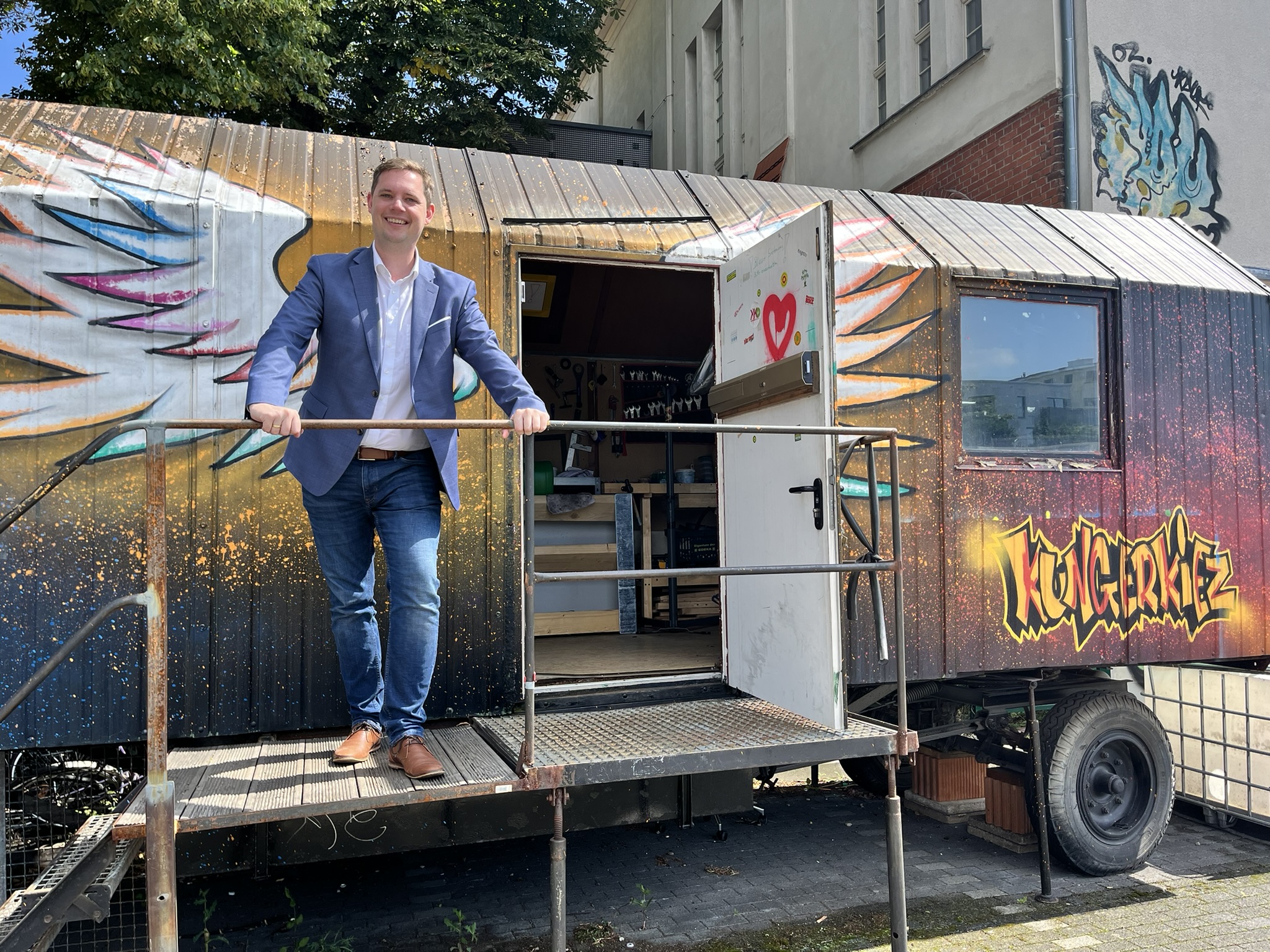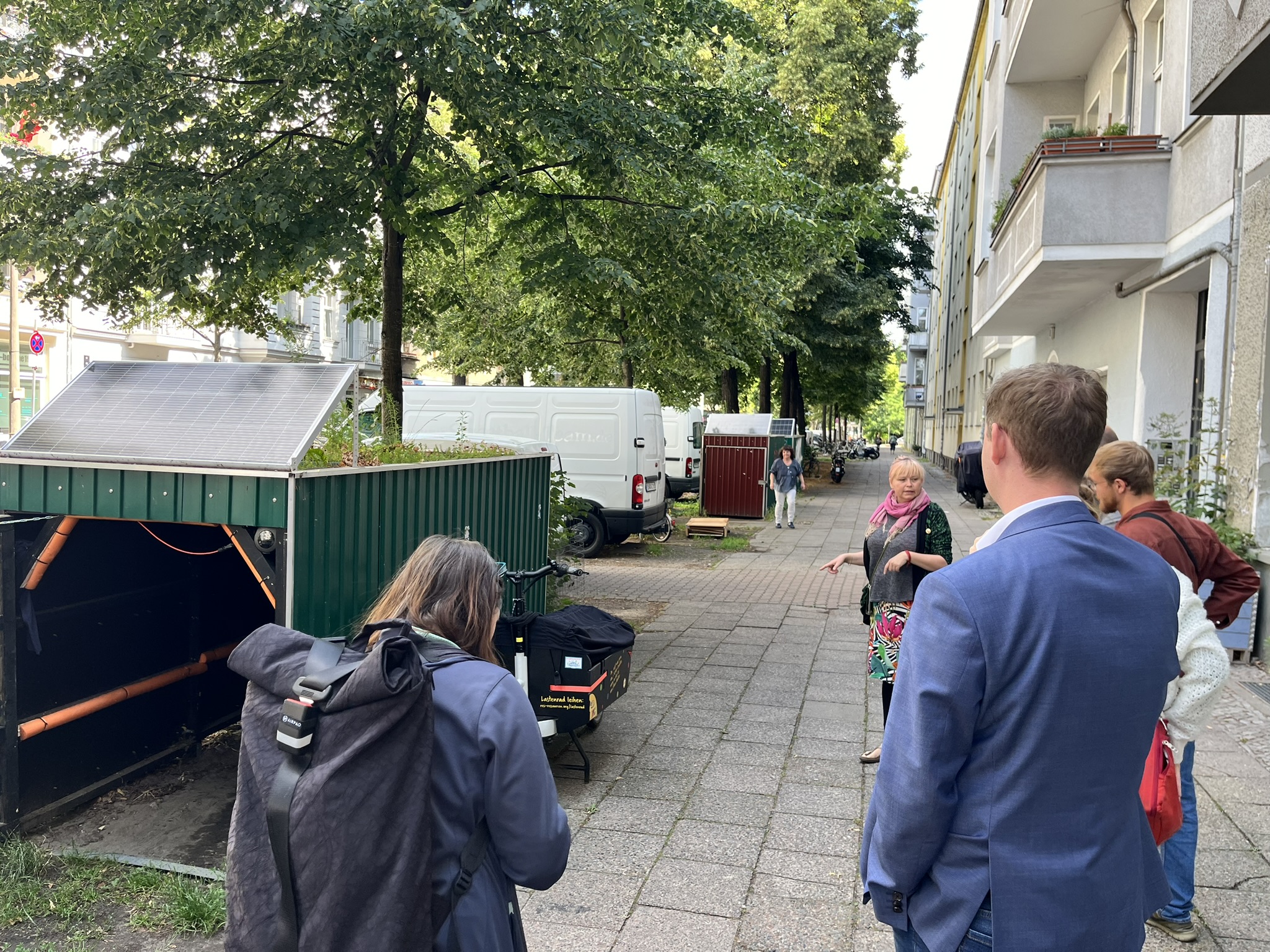 Am folgenden Tag stieß Bürgermeister Glüsenkamp zur Gruppe dazu, und der Tag begann mit der Besichtigung des Kunger Kiez in Berlin Alt-Treptow. Die Kunger Kiez Initiative, ein Partnerprojekt von MitMachKlima, setzt hier das Projekt „Prima Klima Kunger Kiez“ um. Finanziert durch Mittel des Bundesministeriums für Wirtschaft und Klimaschutz, setzt die Initiative auf die enge Zusammenarbeit in der Nachbarschaft. Besucht wurden verschiedene Projekte der Initiative, wie ein begrüntes Parklet und die gut besuchte „Resi“.