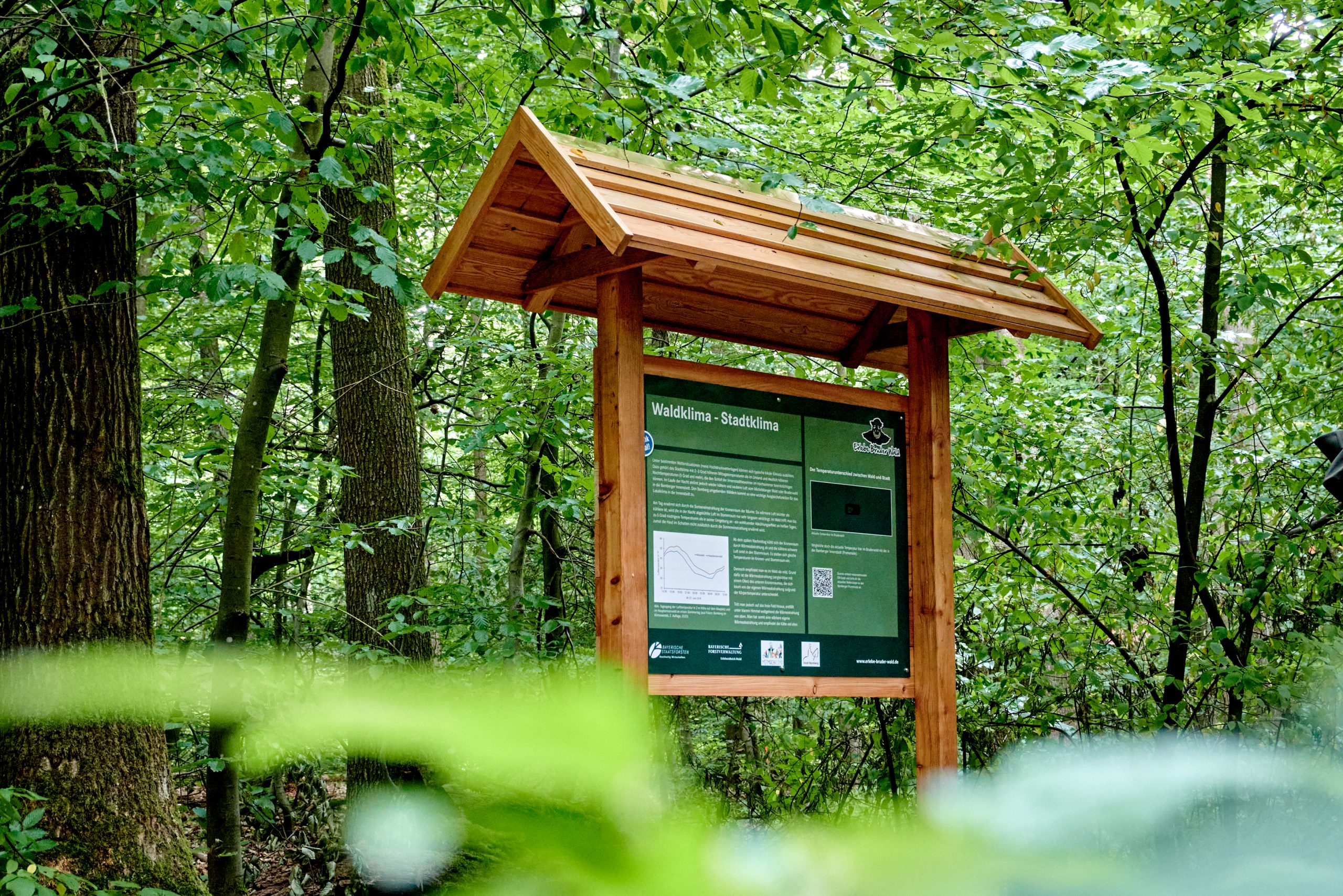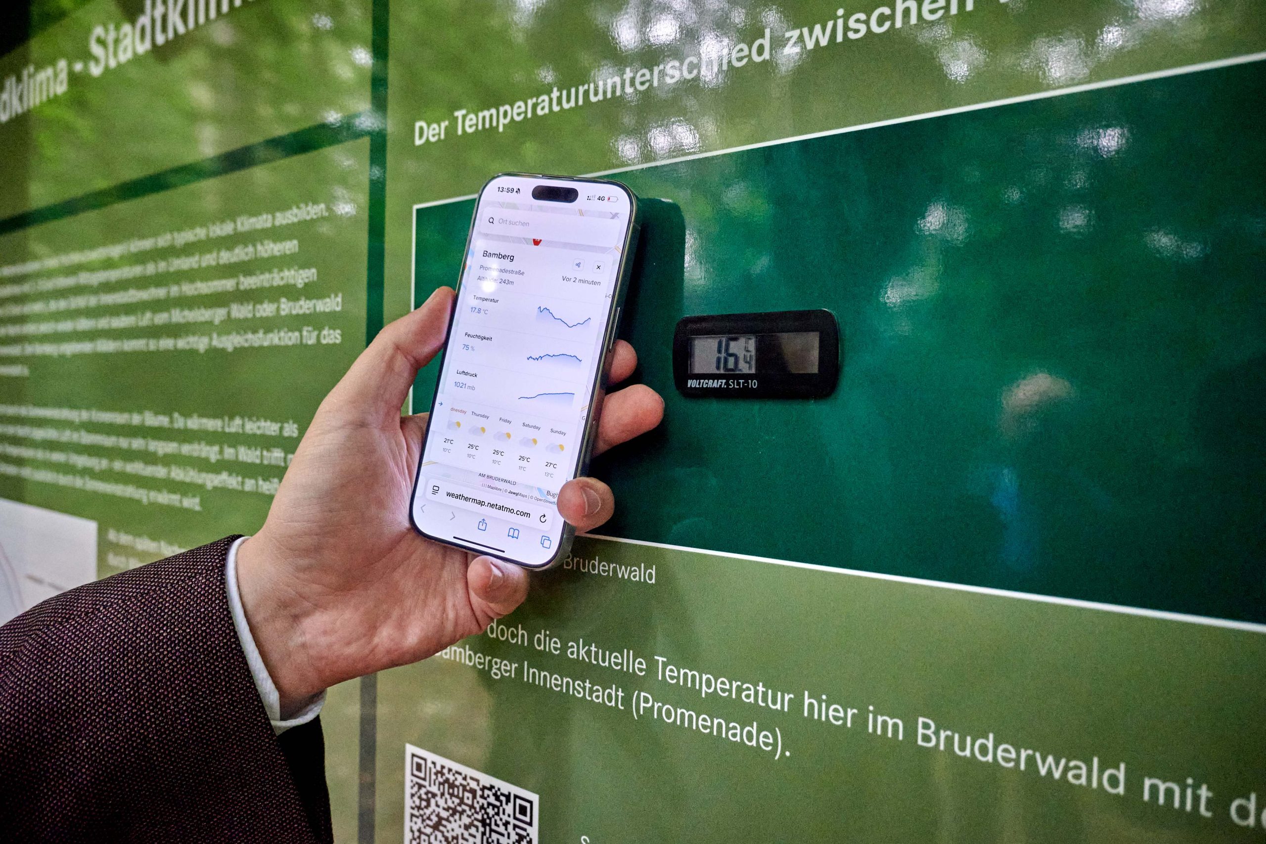 Ebenfalls neu ist die Tafel „Waldklima – Stadtklima“. Sie macht erlebbar, wie die Temperaturen an warmen, sonnenreichen Tagen im Wald bis zu fünf Grad niedriger sein können als im Umland. Ein Thermometer zeigt die aktuelle Temperatur im Wald an, während ein QR-Code es ermöglicht, die Temperatur direkt auf dem Smartphone mit der Temperatur in der Bamberger Innenstadt (Promenade) zu vergleichen.