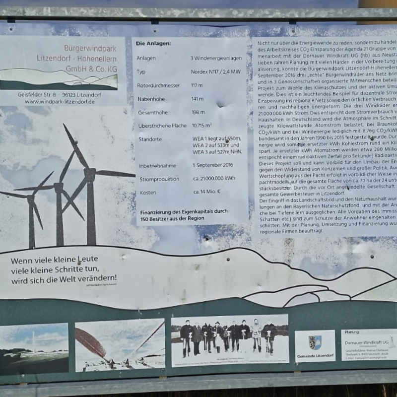 Das Vorhaben wurde zunächst auf Landkreisebene fünf Jahre lang blockiert, während Gemeinderat und Öffentlichkeit durch gute Informationsveranstaltungen von Ortsansässigen schnell überzeugt werden konnten. Die lokale Agenda 21-Gruppe reagierte aber trotz aller Hindernisse schnell und schaffte es, Grundstückseignerinnen und -eigner für die Idee zu gewinnen. So wurde ein Flächenpachtvertrag abgeschlossen, der alle 25 Besitzerinnen und Besitzer einbezog. Letztendlich führte die Zusammenarbeit zwischen der Gruppe als Ideengeberin und der Gemeinde Litzendorf sowie der Dornauer Windkraft UG zum Erfolg.